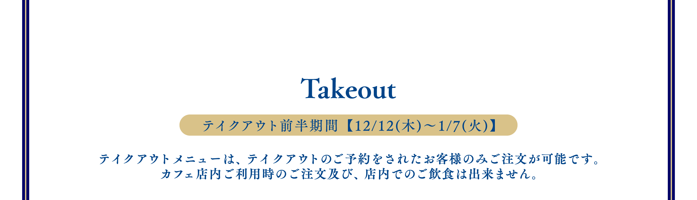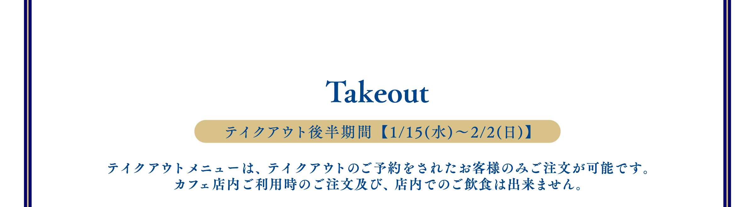 ※1回のご注文でオーダーいただけるメニューの数量に制限をかける場合がございます。また、制限の数は会期前・会期中に関わらず、予告なく変更になる場合がございます。