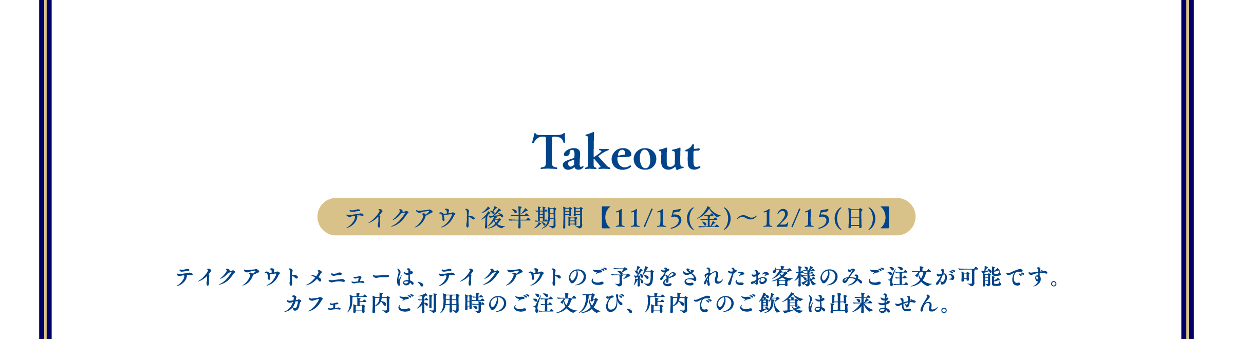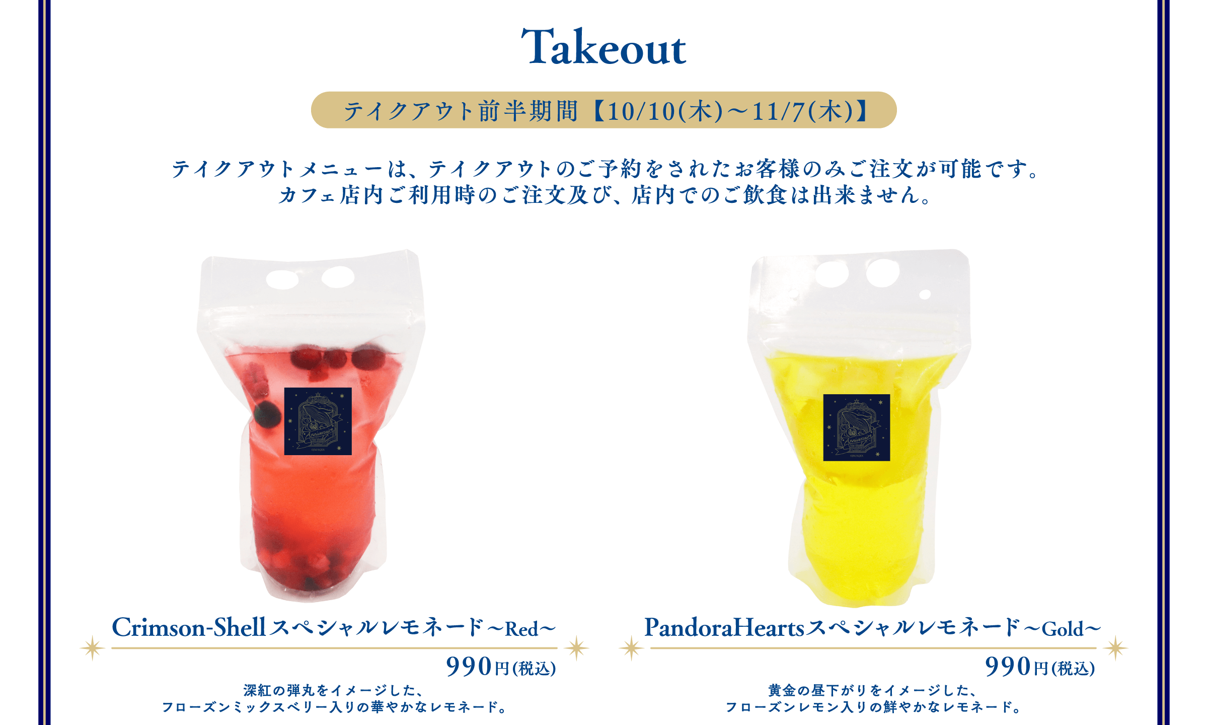 ※1回のご注文でオーダーいただけるメニューの数量に制限をかける場合がございます。また、制限の数は会期前・会期中に関わらず、予告なく変更になる場合がございます。